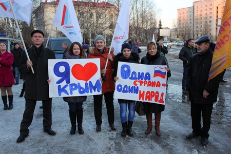 «Мы, воркутинцы, внимательно смотрим, как проамериканские силы не хотят, чтобы крымчане воссоединились с нами. Воркутинцы заняли активную позицию по поддержке наших братьев и сестер. Мы организовали автопробеги, такие как «Крым, мы с тобой», «Россию на колени не поставить». Мы приняли беженцев и участвовали в сборе гуманитарной помощи», - поделился заслугами жителей заполярья член общественной палаты Коми из Воркуты Семен Мостуненко, который зачем-то при этом держал на руках ребенка.