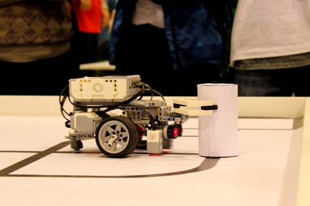 На одной из площадок участникам нужно было запрограммировать машину так, чтобы она выбивала из очерченного квадрата цилиндры только белого цвета, обходя черные. Сделать это нужно было быстрее соперников и не потерять баллы, ухватившись за предмет не того цвета.