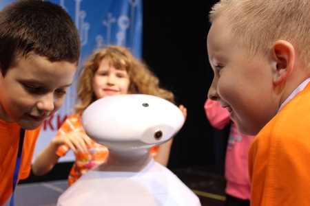 Самые маленькие участники фестиваля облепили робота, который умел весьма осознанно отвечать на вопросы. Его спрашивали, какое его любимое блюдо (макароны с котлетами), выиграет ли сборная России в хоккей («Наши всегда побеждают!»), может ли он упасть (нет) и быстро и непонятно говорить (да).