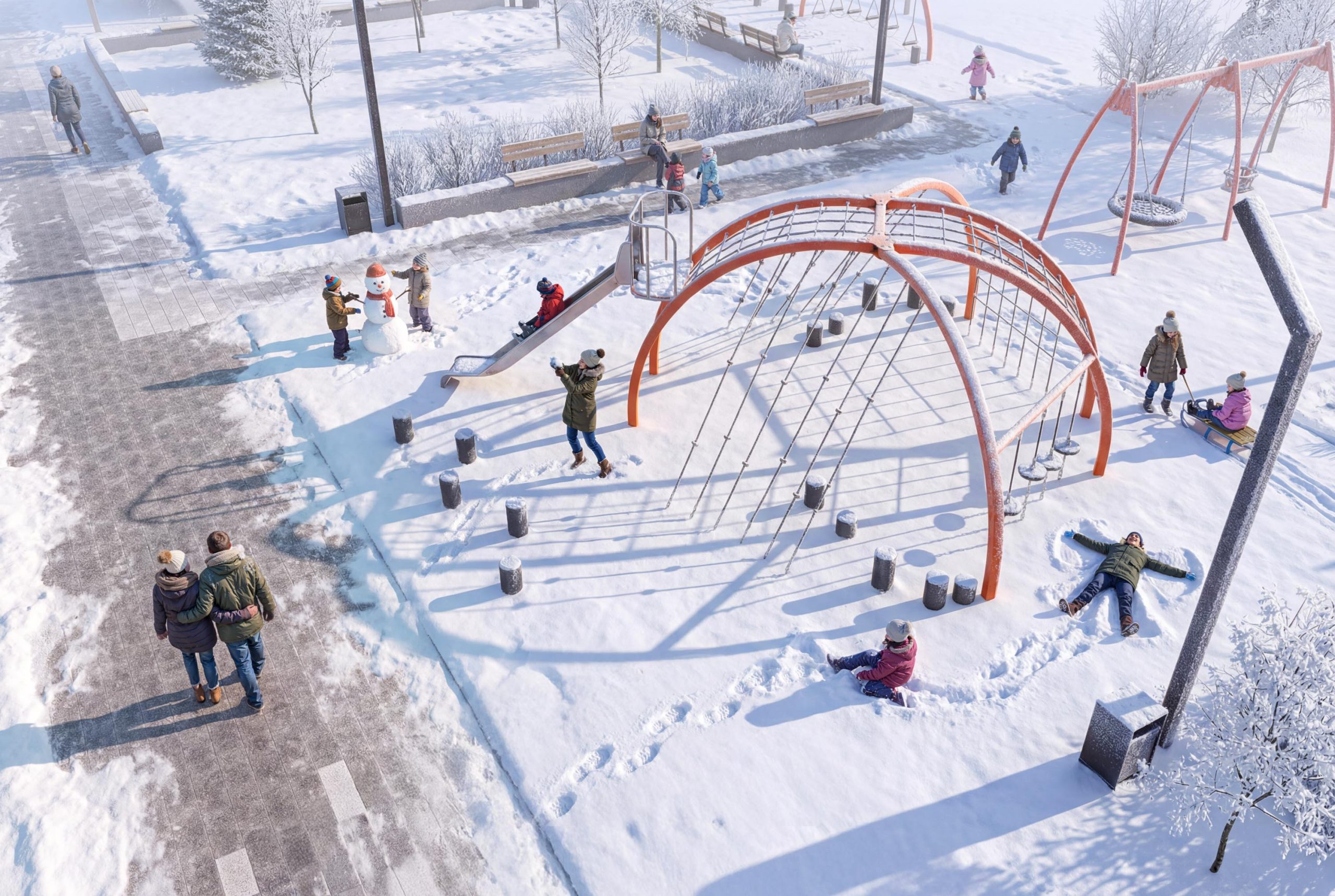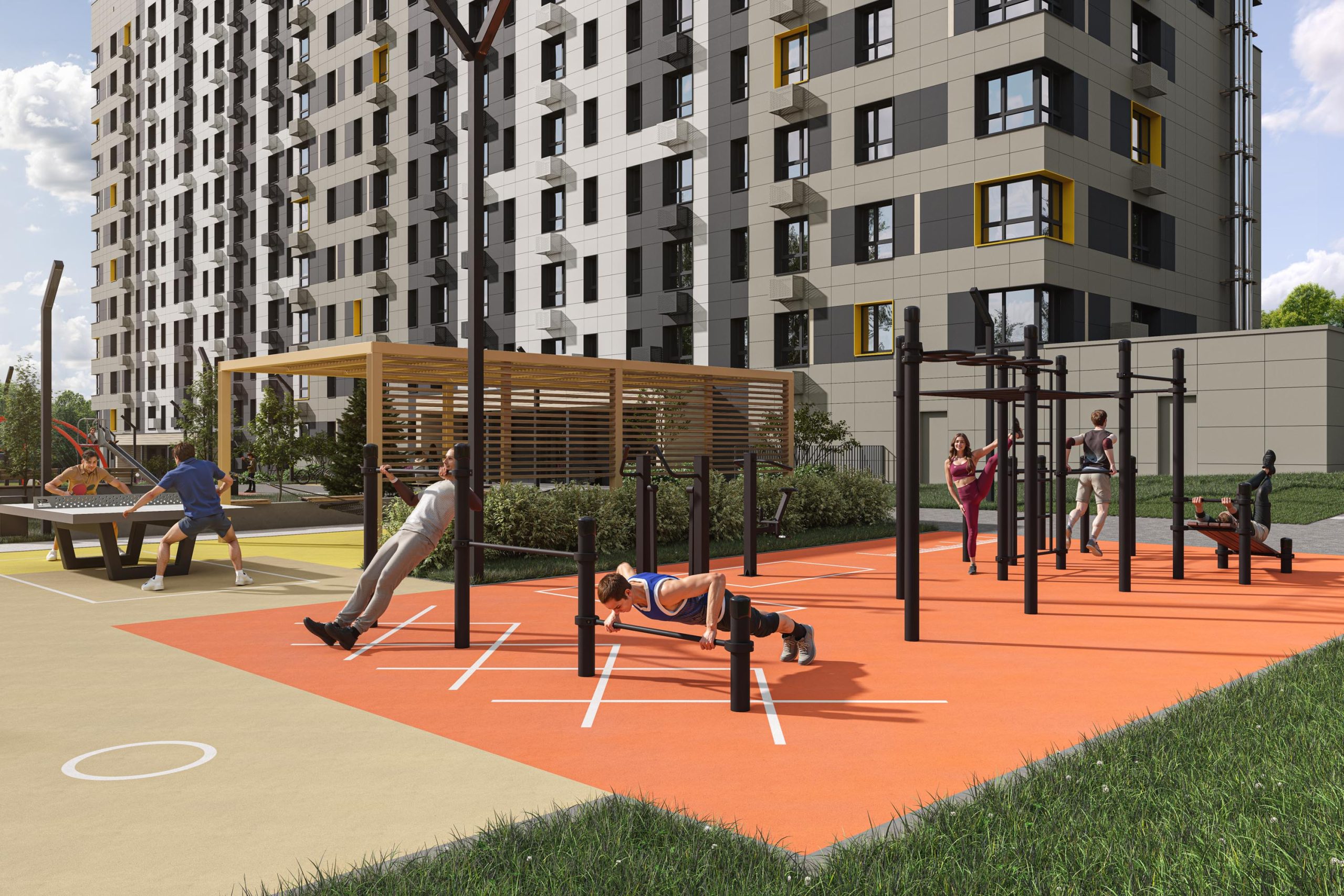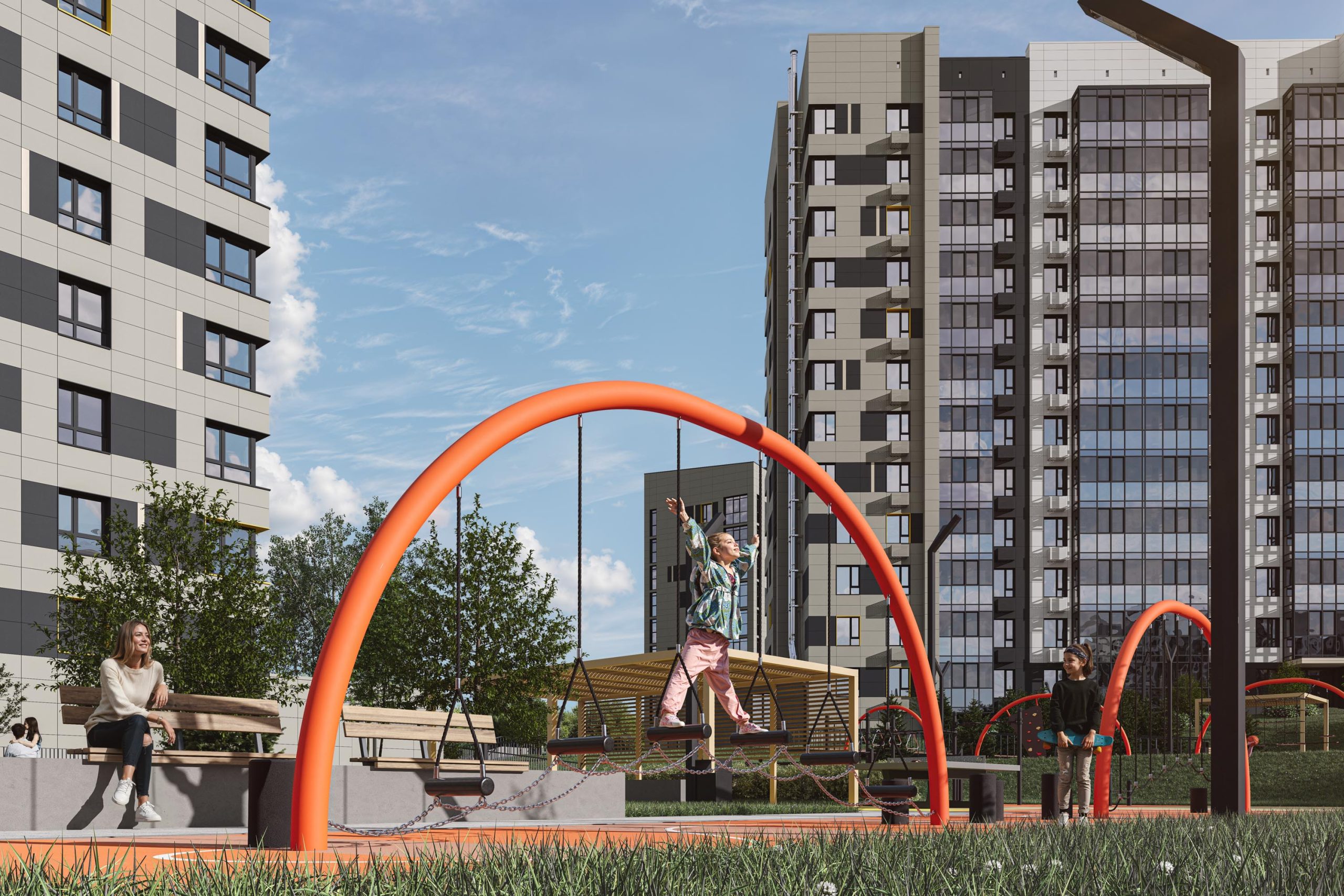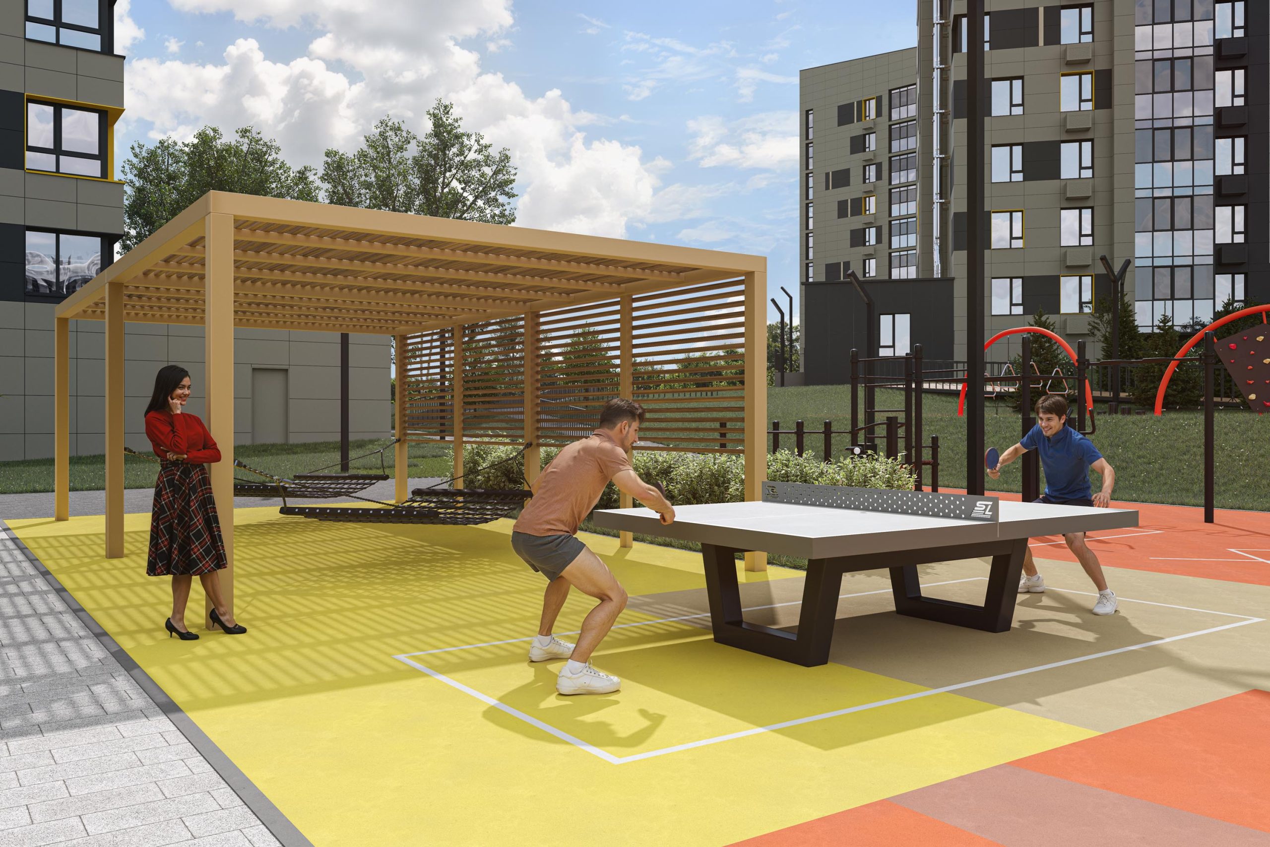 - Двор продолжает территорию четвёртого дома, расширяя границы жилого комплекса. Чтобы пространство было единым, СКАТ, создавая зоны для отдыха, игр и занятий спортом, использует те же приёмы ландшафтного дизайна: разное покрытие двора от специальной террасной доски до безопасной пружинящей резиновой крошки; озеленение, которое выглядит по-разному в разные сезоны; игровое оборудование для детей разных возрастов; интересные решение, вроде поля для игры в мяч, в центре которого большая мачтовая воронка.