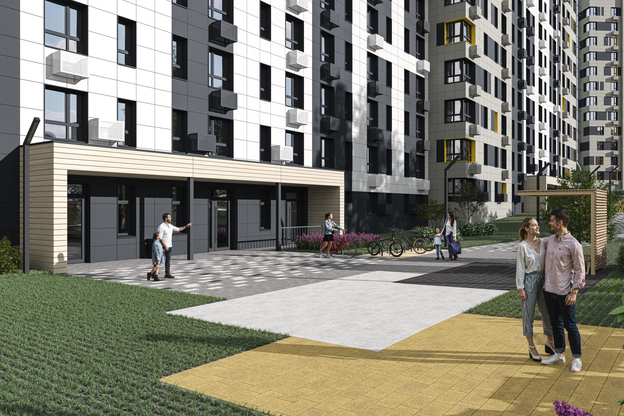 - Сквозные подъезды на уровне земли со светопрозрачными входными группами, холлы с красивой отделкой, колясочными и велосипедными.