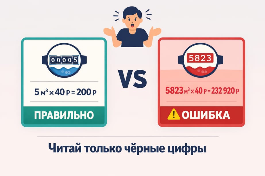 Представьте: реальное потребление за месяц — 5 кубов. На табло написано 00005,823. Невнимательный жилец вписывает в графу показаний не 5, а 5823.