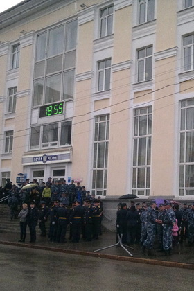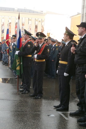 После этого на площадь вышли участники парада: знаменная группа, военный оркестр, военнослужащие сыктывкарского гарнизона, сотрудники сыктывкарского ОМОНа, подразделения УФСИН, МЧС и УФССП. Зрители заметили, что, как и полагается, строевым шагом на репетицию вышли только бойцы 110-го учебного инженерно-саперного полка внутренних войск МВД России.