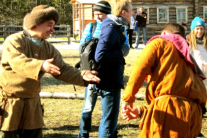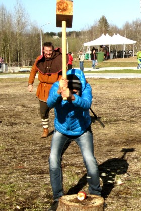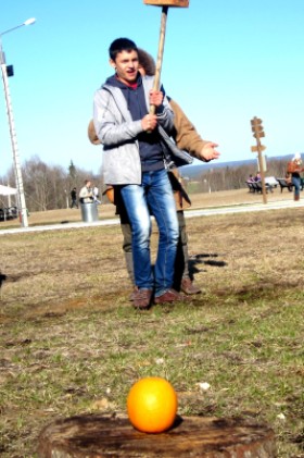 Многие из посетителей решили проверить свою силу в молодецких игрищах. Не только мужчины, но и представительницы прекрасного пола рискнули взять в руку деревянные молоты.