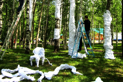 Рядом с детской частью парка расположилась замысловатая инсталляция. На трехъярусной тумбе под колпаками из пластиковых бутылок расположились изображения улиток, деревьев и Николая Баскова, который улыбался с экрана миниатюрного телевизора. Там же корреспондент «КомиОнлайн» наблюдал за тем, как деревья, стулья и вешалки оборачивают огромным количеством белой бумаги, создавая нереальное эфемерное пространство. Но на вопрос, что все это значит, создатели инсталляции ответить затруднились.