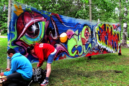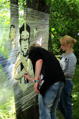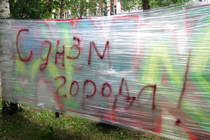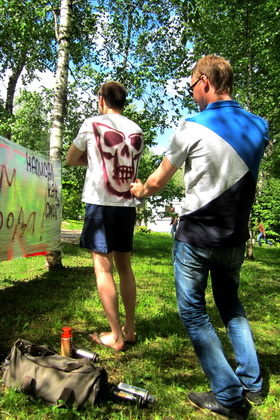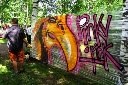 Для любителей украсить крупноформатные поверхности при помощи баллончиков с краской в этом году предоставили необычное поле для творчества. Между деревьями растянули несколько рулонов пищевой пленки, на которой и творили талантливые юноши и девушки столицы.