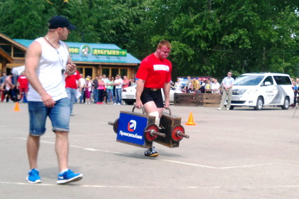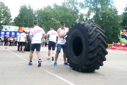 Затем силачи носили 300-килограммовые деревянные конструкции - «колодцы», бегали со 120-килограммовыми чемоданами, переворачивали на скорость внушительных размеров автомобильные покрышки.