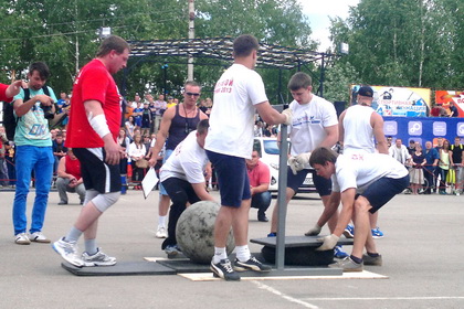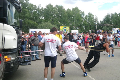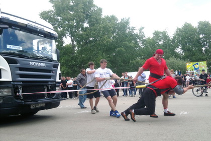 После этого спортсмены по традиции тянули автомобиль. На этот раз организаторы предложили им сдвинуть с места 17-тонный грузовик. Испытать судьбу в этом конкурсе вызвался один из зрителей и, как оказалось, справился с заданием успешно.