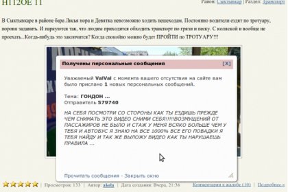 Нарушитель оставил письмо с угрозами в адрес онлайн-дозорного на «Доске позора Коми», где написал, что он не получал претензий от пассажиров, имеет большой стаж вождения и знает автобус и его повадки на тысячу процентов. Он обещал найти активиста и снять на видео его нарушения.