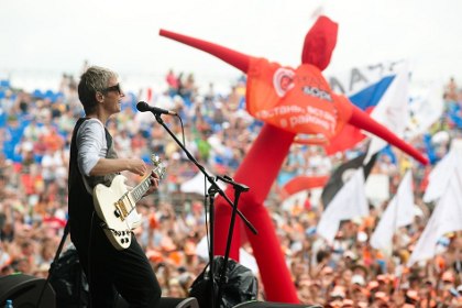 Музыкальная программа первого дня начиналась не днем, как это обычно бывает, а в 18:00: организаторы предусмотрели, что не все смогут приехать рано. А вот те, кто смогли, получили возможность послушать саундчеки сразу нескольких исполнителей. Так, группа «Би-2», бывшая одним из хедлайнеров, фактически сыграла полноценный концерт, так что в положенное для выступления время я слушала все песни по второму разу. Для ярых поклонников Шуры и Левы это был настоящий подарок. Открыли же первый день гости из Украины - «Воплi Вiдоплясова». Лидер группы Олег Скрипка так лихо отплясывал на сцене, что довел толпу до состояния легкой эйфории уже к третьей песне.
