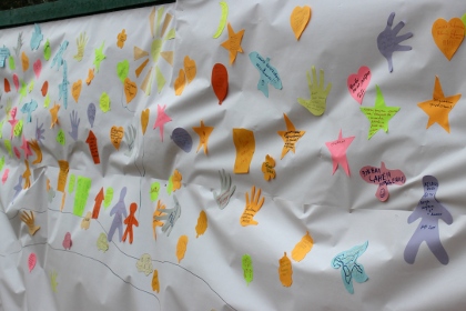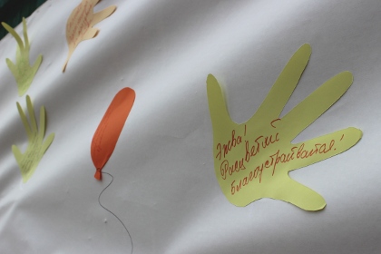 Зато огромное бумажное полотно, висевшее чуть дальше на заборе, привлекало куда больше внимания. На нем любой желающий мог оставить свое пожелание Эжве, передать привет и вообще написать все, что ему вздумается. Писались пожелания на ладошках, шариках и сердечках, вырезанных из цветной бумаги, а затем наклеивались на полотно. Свои поздравления на него наклеили и В.Гайзер, и И.Поздеев, и ректор Сыктывкарского госуниверситета Марина Истиховская.