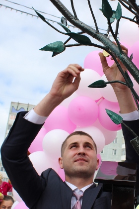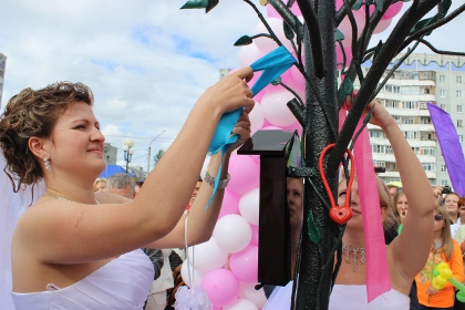 Оно предназначалось для чествования двух пар молодоженов и, по всей видимости, одновременно являлось символом парка, который вскоре появится на этом месте. Презентация дерева опять же проходила при участии главы республики и его коллег. Они втроем стянули с него покрывало и объявили о том, что теперь на ветки можно вешать замочки, символизирующие крепость брака. Чем молодые пары и занялись минуту спустя.