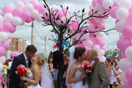 Сначала они, пошептавшись друг с другом, совместно загадали желание, а затем новоиспеченные мужья повесили замочки на дерево, а их жены повязали разноцветные ленточки. Толпа принялась скандировать «Горько!», и совершенно счастливые супруги от души поцеловались.