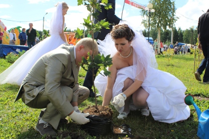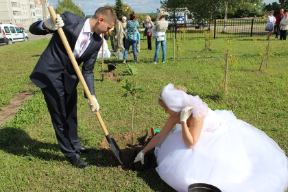 Тем временем молодожены отправились к газону, чтобы высадить деревца на «Аллее молодых». Каждая пара посадила по одному клену. Присоединиться к этой акции может любой житель Эжвы.