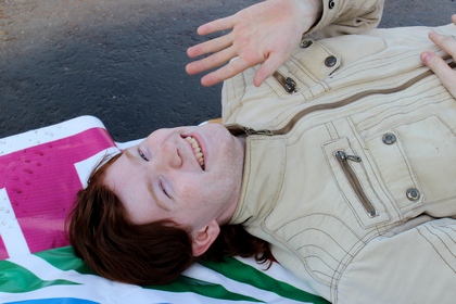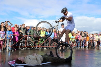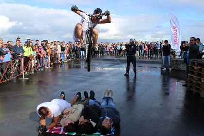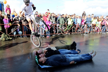 Сначала они попросили выйти на площадку добровольца, который не боится рисковать. Вызвавшегося молодого человека уложили на асфальт и сказали не шевелиться. Парень побледнел, но повиновался. Минуту спустя над ним пролетел первый велосипед, по пути выделывая невероятные трюки, а затем, без всякого перерыва, второй. Фееричные прыжки под рев взбудораженной толпы продолжались еще минут пять, но тут экстремалам стало скучно. Они потребовали еще одного добровольца, которым стал председатель молодежного парламента Коми Александр Кузнецов. Однако и двух человек велосипедисты перепрыгивали без проблем, поэтому третьей на асфальт легла уже ведущая «Ыбицы». Количество тел увеличивалось, страсти нарастали, но велосипедисты продолжали с легкостью преодолевать живые препятствия.