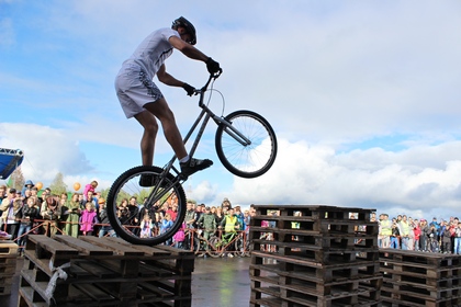 Трудности начались, когда молодым людям пришлось прыгать по поставленным друг на друга деревянным поддонами, имевших различную высоту. После первого же прыжка один из велосипедистов приземлился на асфальт без своего транспорта. Остальные вершины он взял чище, но все же с видимым напряжением.