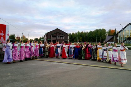 По приезду в Ыб участников форума встретили сотрудники этнопарка в национальных костюмах.