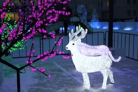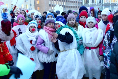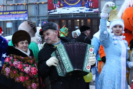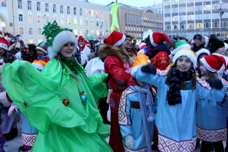 Затем на сцену вышли главные Дед Мороз и Снегурочка города. Они научили собравшихся танцевать, вместе с участниками парада вспомнили любимые песни, поводили хоровод вокруг елки, после чего зажгли ее огоньки.
