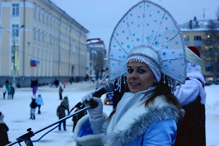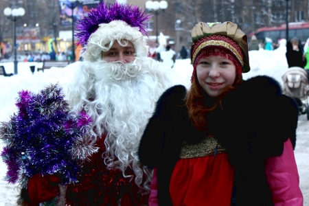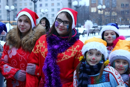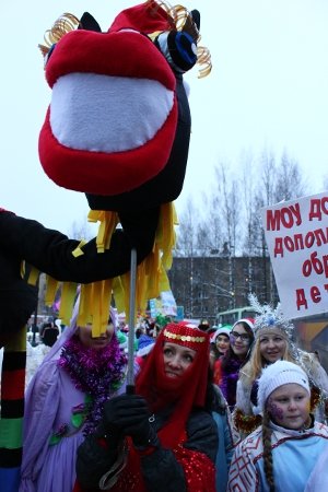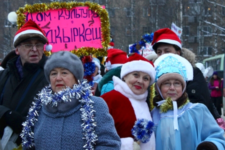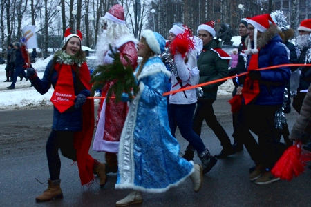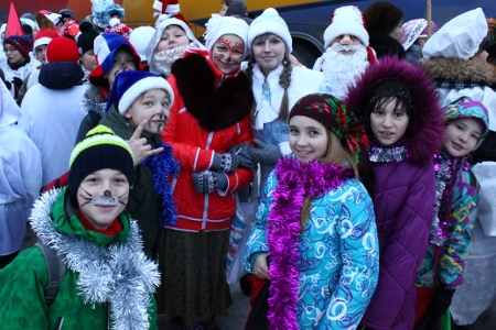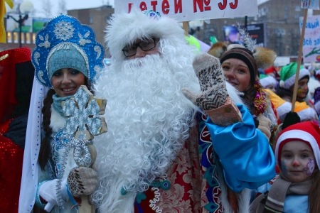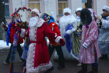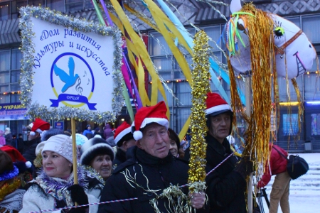 Дедов Морозов, а их собралось около 20-ти, окружала самая разношерстная свита. Снеговики, елки, Баба Яга, тигры, коровы, зайчата и, конечно, символ грядущего года – лошади всех мастей. Все они веселились, пели песни, поздравляли прохожих с наступающим Новым годом и читали стихи. После того, как все колонны были в сборе, шествие двинулось по Коммунистической улице, которую специально на время перекрыли, к Стефановской площади.