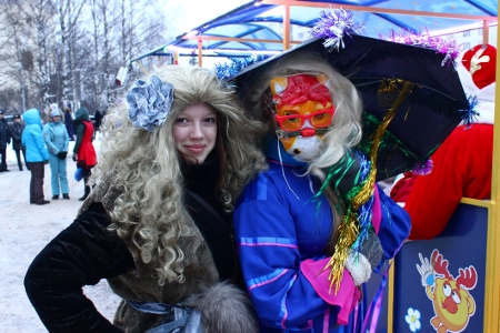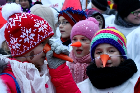 По пути снеговики дарили проходящим мимо людям листочки с поздравлениями, а переодетые в цыганок девочки предлагали за умеренную плату погадать по руке.