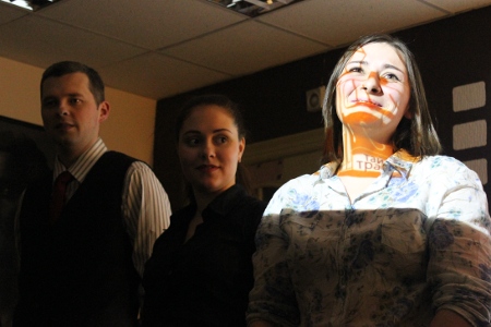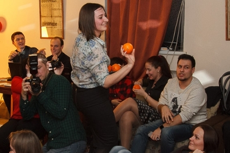 Следующей была девушка-химик Ольга Сукрушева, чье выступление было посвящено антиоксидантам. Она рассказала, что они содержатся в цитрусовых (тут в зале были розданы апельсины), орехах (они бурной реакции у зрителей не вызвали) и зеленом чае. «В человеческом организме есть множество клеток и если они здоровы, то они радостны. Но также есть и другие частицы -радикалы. И вот когда они не в настроении, они нападают на радостные клетки. А антиоксиданты, являясь защитниками, сдерживают радикалов», - рассказала О.Сукрушева. Коллеги химика по институту химии разработали препарат, который помогает антиоксидантам защищать клетки от радикалов.