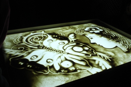 Двери открыли, и только все желающие расселись, как в фойе началось песочное шоу. Чтобы не пропустить все самое интересное, зрители вышли из зала, из-за чего холл снова стал несколько похож на Вавилон.