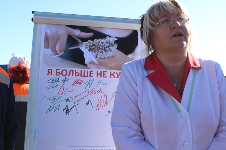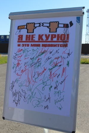 Женщина-врач призывала расписаться на доске всех, кто бросил или собирается бросить курить. Очень скоро одной доски не хватило, и работники переключились на вторую.