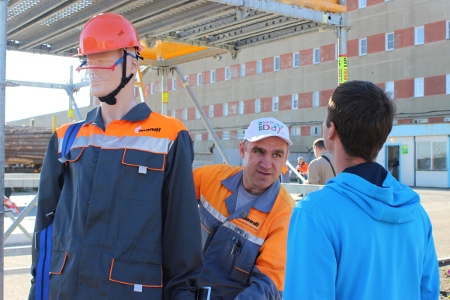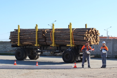 Тут же стоял манекен, на котором показывали, как рабочая одежда и каски предохраняют от возможных травм и повреждений. Немного вдалеке припарковались два большегруза с бревнами: здесь нужно было объяснить, как правильно крепить груз.