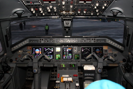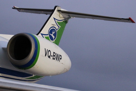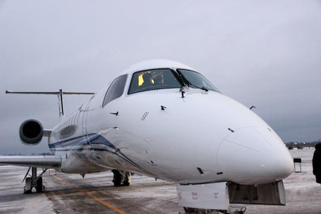 Он не заставил себя долго ждать. Бразильское миниатюрное судно появилось на фоне сурового северного неба в виде НЛО — яркого светящегося шара. Embraer спустился на минимальную высоту, тихо и изящно пролетел над стоящими на взлетке L-410, боингами, вертолетами, кладбищем самолетов и скрылся в облаках.