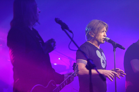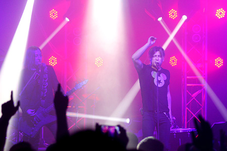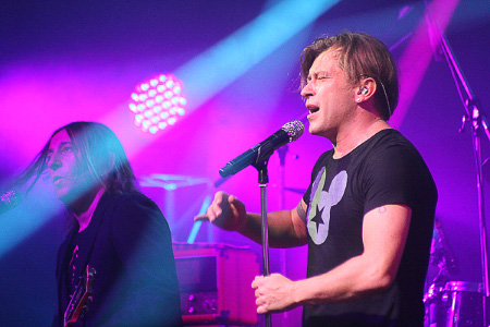 Блок старых песен тем временем все не заканчивался. Прозвучали «Вечная, призрачная, встречная», «Научи меня быть счастливым», «Скользкие улицы» и «Серебро». Последняя композиция, пожалуй, стала главным событием концерта. Одна из самых популярных, программных и известных песен группы исполнялась в сопровождении чудесного соло на флейте Яника Николенко. Помимо виртуозной игры на инструменте, он покорил зрителей до чрезвычайности богатой мимикой лица, которое попеременно выражало благоговение перед мелодией, удовольствие от реакции зала и игривое кокетство.