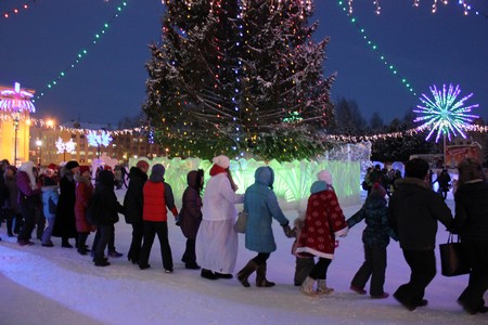 Старт шествия начинался 26 декабря в 14:30 на Театральной площади. Участники парада, томившиеся в ожидании перекрытия основной улицы Сыктывкара – Коммунистической, - пели и плясали на морозе, который ударил именно в этот день. Еще до начала движения процессии стало понятно, что фантазию участники не сдерживали.