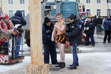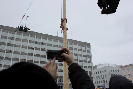 Конечно, основное внимание было приковано к столбу, на который один за другим в порядке живой очереди взбирались смельчаки, желающие прихватить с собой, помимо настроения, еще и призы.