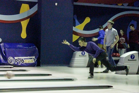 После небольшой разминки - даже проверенным «бойцам» нужно приноровиться к броскам - начался основной этап соревнований. Первый час турнира прошел напряженно: сосредоточенные игроки, почти не разговаривая, бросали шары и отсчитывали сбитые кегли.