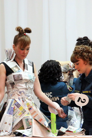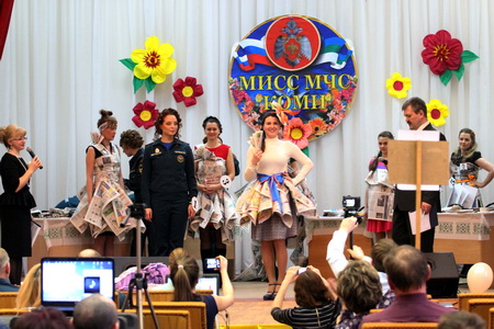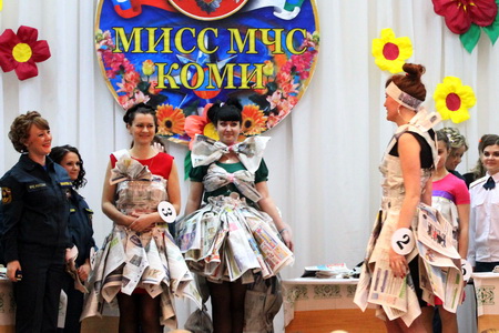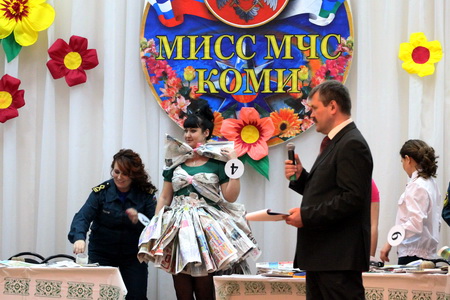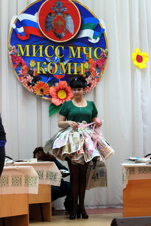 Ее главная соперница из Сыктывкара — техник центра ГИМС МЧС Коми Елена Бегунова - смастерила из продуктов питания корабль, из газет «сшила» бальное платье, за несколько минут соорудила прическу с применением флага России и показала детскую сценку «Мир во всем мире».