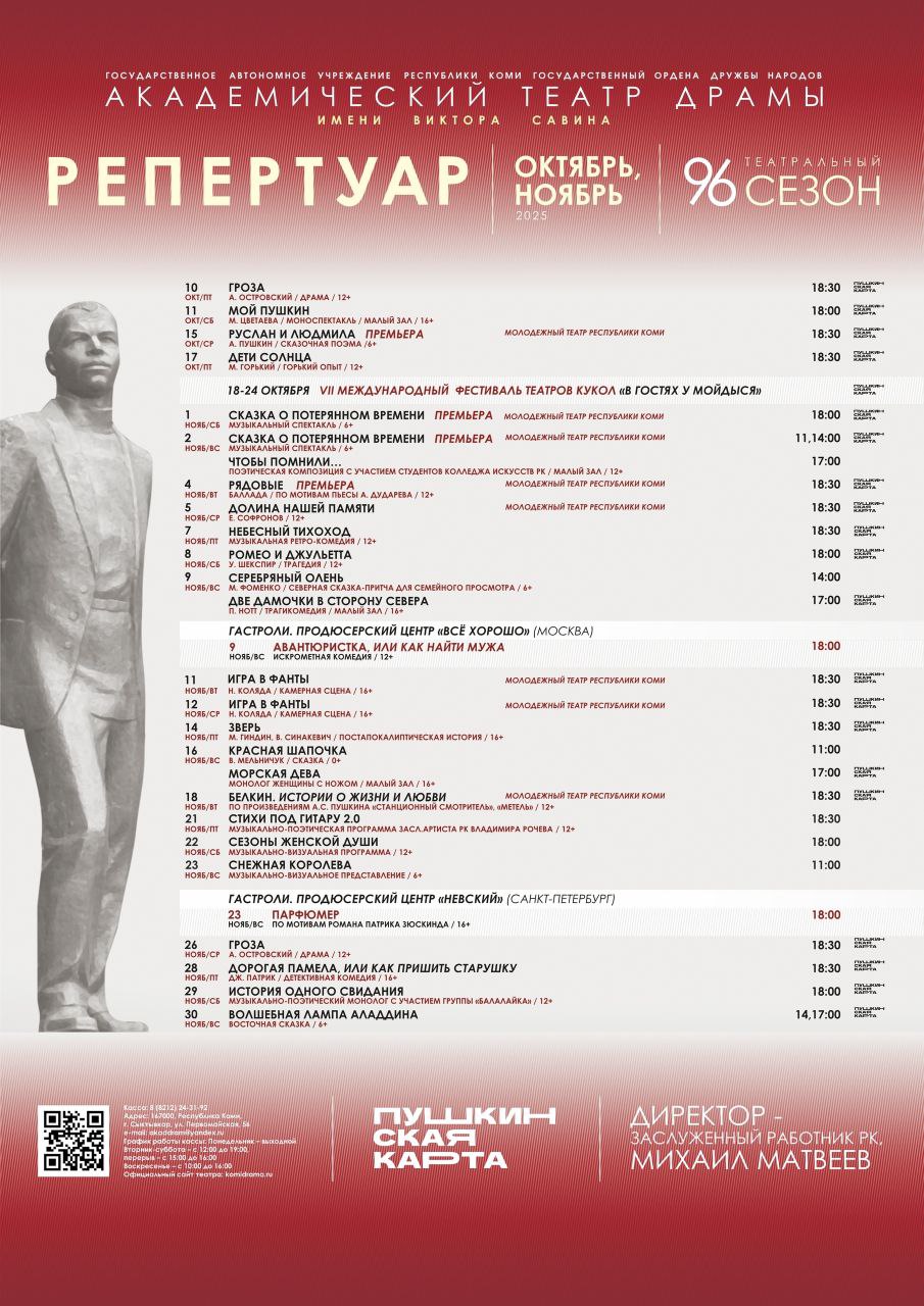 Ноябрь — идеальное время, чтобы погрузиться в мир театра! Украсьте вечера самыми разными историями: от проверенной классики до смелых современных постановок. Выбирайте свой спектакль Театра драмы им. В. Савина и проведите время с удовольствием! 🎭