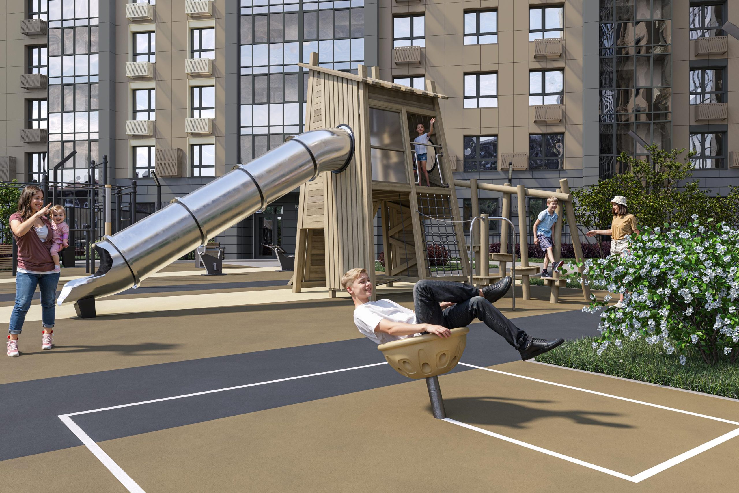 У жителей будет своя парковка за шлагбаумом и закрытый от посторонних двор с 2,5-метровым забором. Придомовая территория поделена на тематические зоны. Для занятий спортом — тренажёры и воркаут. Для детей — разнообразное развивающее игровое оборудование: песочница под навесом, большая горка с лазалками, качели, батут, полоса препятствий, уличный твистер и пружинная платформа. Для спокойного отдыха — скамейки и столы под навесами. На прилегающей территории пройдут удобные пешеходные транзитные пути, появятся живая изгородь из кустов, фонари и уличные велопарковки.