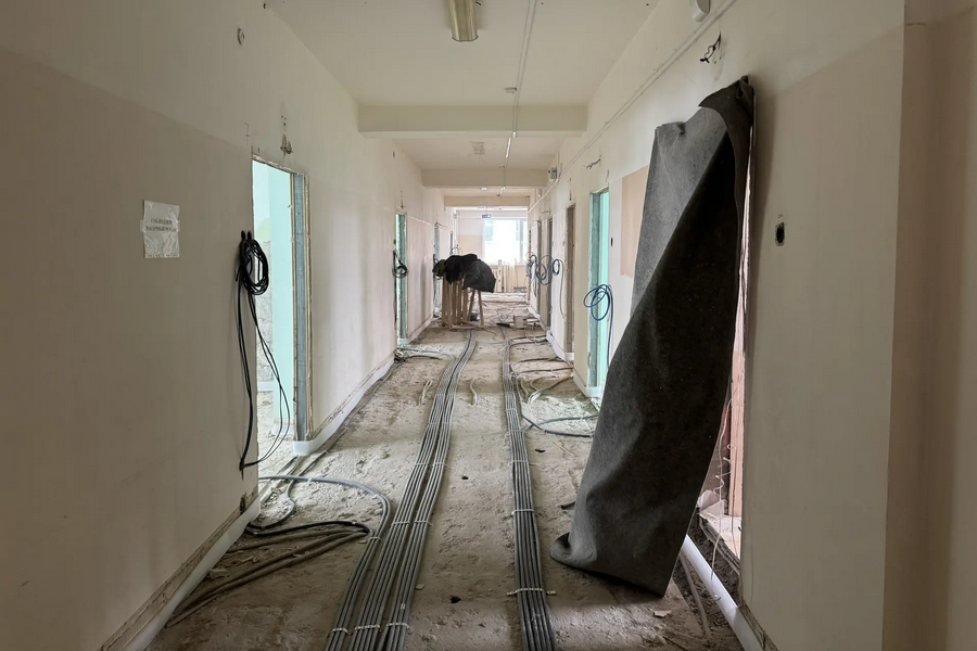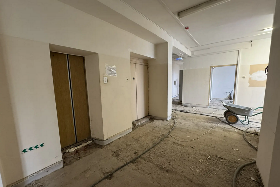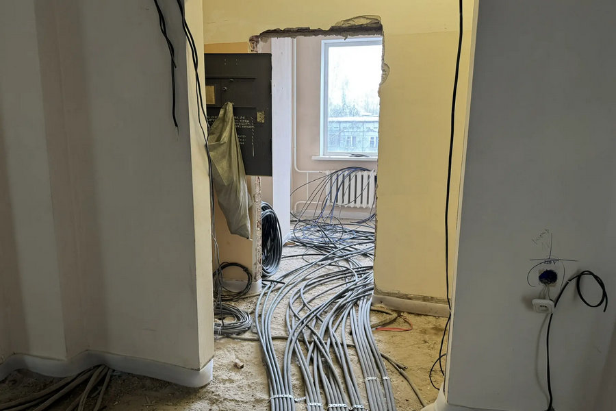 Ремонт на пятом этаже планируют завершить к концу апреля. Сейчас там подготавливают стены и потолки, меняют окна. Рабочие отмечают последовательность работ.