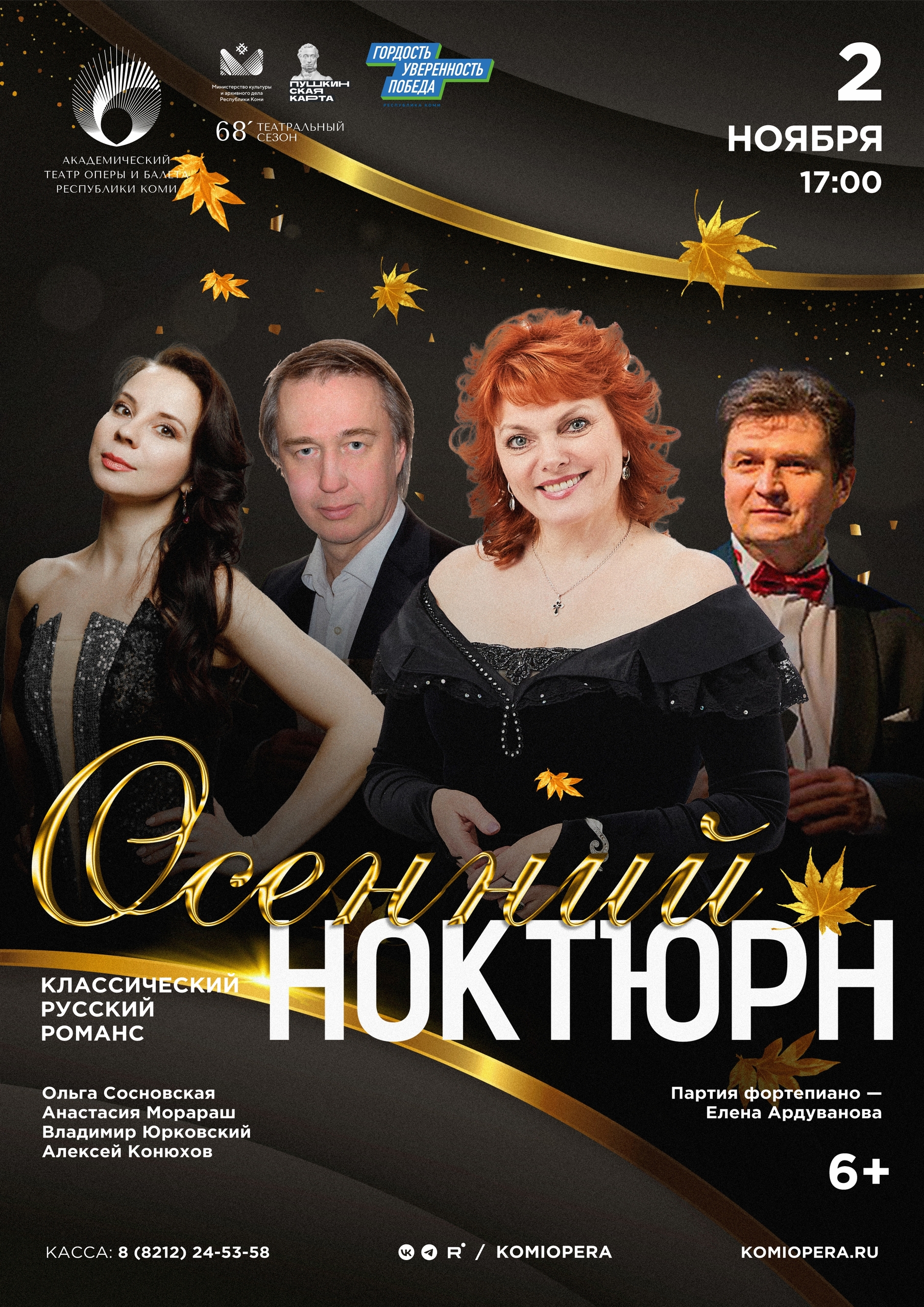 Вечер 2 ноября «Осенний ноктюрн» будет посвящен классическому русскому романсу. Произведения великих композиторов XIX-XX веков подарят зрителям лирическое, осеннее настроение. Проникновенное исполнение известных романсов в исполнении талантливых артистов Ольги Сосновской, Анастасии Морараш, Екатерины Поповой, Алексея Конюхова и Владимира Юрковского. За роялем – Елена Ардуванова.