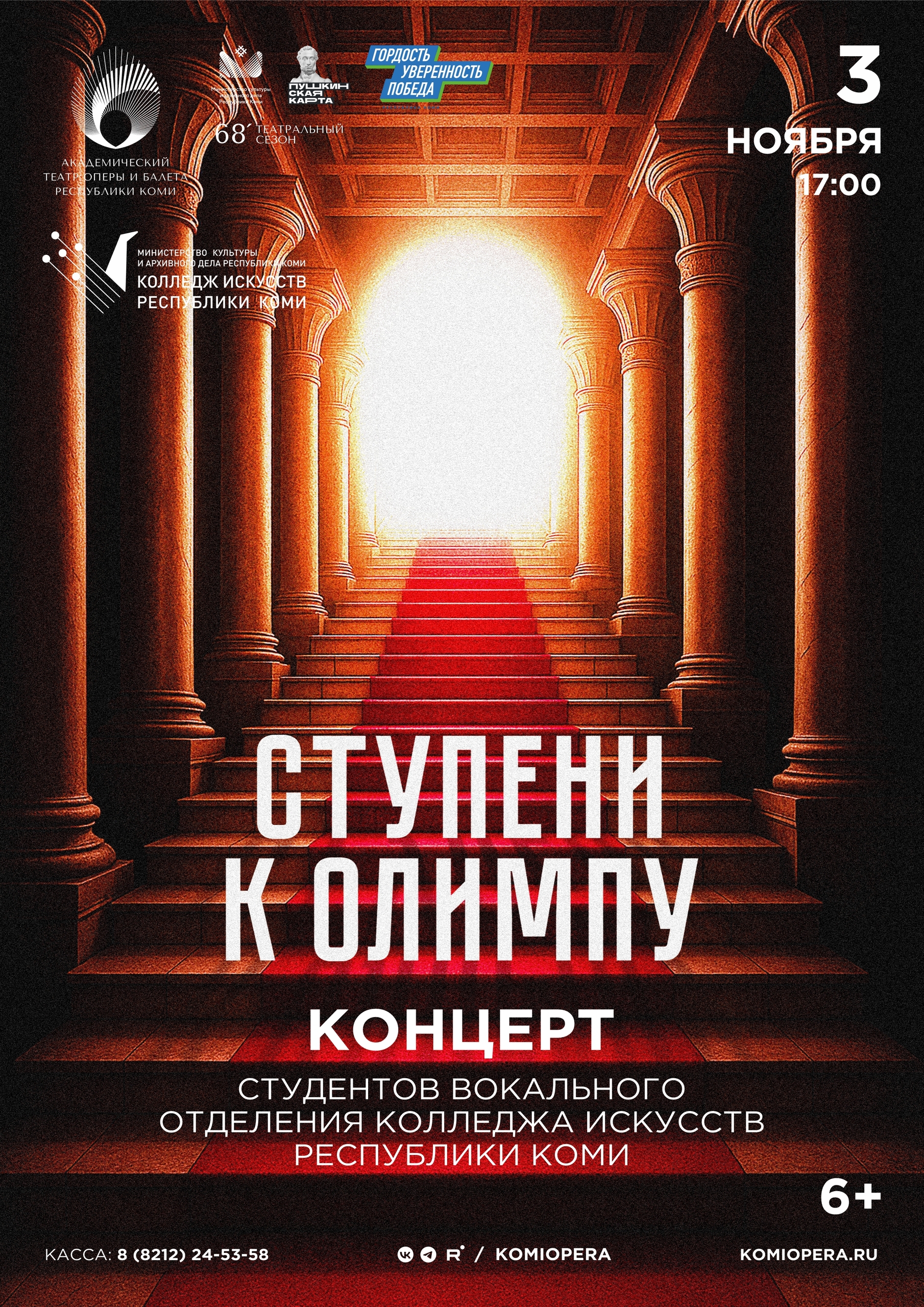 Также 3 ноября на камерной сцене театра в концертной программе «Ступени к Олимпу» будут выступать юные таланты – студенты колледжа искусств Коми. Сотрудничество театра и колледжа - многолетний творческий процесс. Каждый творческий сезон театр пополняется молодыми кадрами. Участники концерта в будущем тоже могут стать артистами театра, и зрители уже сейчас смогут открыть для себя новые имена и услышать будущее оперной сцены. В этот вечер на сцену выйдут талантливые студенты второго, третьего и четвертого курсов вокального отделения колледжа, чтобы продемонстрировать свое мастерство и любовь к музыкальному искусству. В их исполнении прозвучат арии из опер, романсы, народные песни и другие произведения, которые позволят оценить широту их репертуара и будущие перспективы. На камерной сцене выступят Диана Алексеева, Наталья Хозяинова, Алена Уханёва, Марианна Залогина, Олеся Орлова, Евгения Конюхова, Дарья Красильникова, Александра Стонкус, Дарья Бойко, Злата Булыгина, Даниил Соколович, Андрей Суровцев, Семен Ильиченко. А музыкальное сопровождение за роялем им составят их наставники Ольга Торлопова, Наталия Никитина, Виктория Тымкив, Сергей Догода, Роман Чисталев. Для многих из них этот концерт станет первым выступлением в Театре оперы и балета.