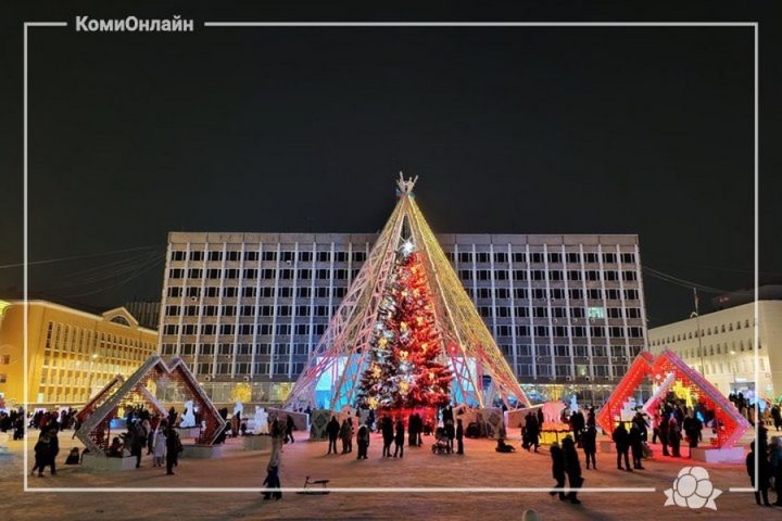 В Сыктывкаре 27 декабря открыли ледовый городок и зажгли главную новогоднюю елку Коми, которую установили и украсили на Стефановской площади. В этом году городок сделали по новой концепции. Над елкой собран 23-метровый световой чум. Для ее украшения потребовалось 700 метров гирлянд с 200 лампами красного, синего, зеленого и желтого цветов. На нее установили 50 светильников в виде бантов, 269 пластиковых шаров и звезду.