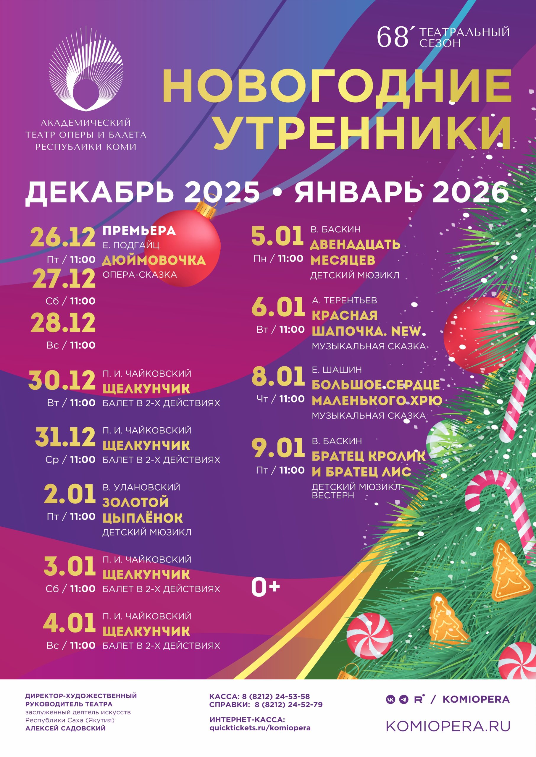 Детская новогодняя афиша предлагает юным зрителям и их родителям погрузиться в мир волшебства и приключений. Зрителей ждут премьерная сказочная опера современного российского композитора Е. Подгайца «Дюймовочка» (0+). «Дюймовочка» – не просто детская сказка, а глубокая философская притча о поиске счастья и смысла жизни, о том, как маленькая и хрупкая девочка может преодолеть большие трудности и испытания, оставаясь верной себе и своим идеалам. Праздничное настроение и особую волшебную атмосферу создадут балет-феерия П. И. Чайковского «Щелкунчик» (0+) и яркие театральные постановки по мотивам русских и зарубежных сказок, зрелищные музыкальные спектакли, наполненные чудесами и приключениями. Сказочные представления подарят детям незабываемые эмоции, научат доброте и дружбе, вдохновят на добрые поступки и укрепят веру в чудо. На сцене театра перед каждым спектаклем развернется анимационная программа, во время которой юные зрители с волшебными персонажами побывают в гостях у Снегурочки.