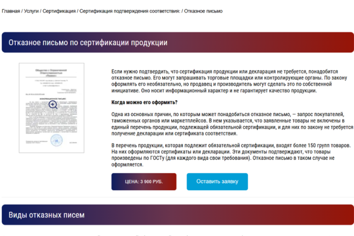 Реализация товаров на различных маркетах требует сертификации соответствия. Этот документ могут потребовать проверяющие инстанции, продавцы и покупатели. Существует ряд товаров, не требующих сертификации. В этом случае, понадобится отказное письмо. Возможность оформить дистанционно сэкономит время и затраты. Среди главных достоинств: высокий сервис; большой выбор; гарантия получения; конфиденциальность; оперативность; приемлемая цена и пр.