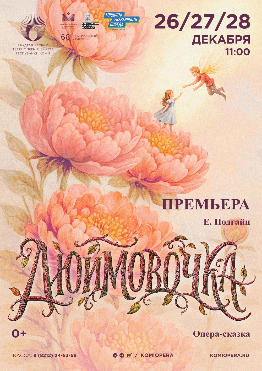 Академический театр оперы и балета Коми в преддверии новогодних праздников 26, 27 и 28 декабря представляет премьерную постановку сказочной оперы известного современного российского композитора Ефрема Подгайца «Дюймовочка», либретто Роксаны Сац и Виктора Рябова.