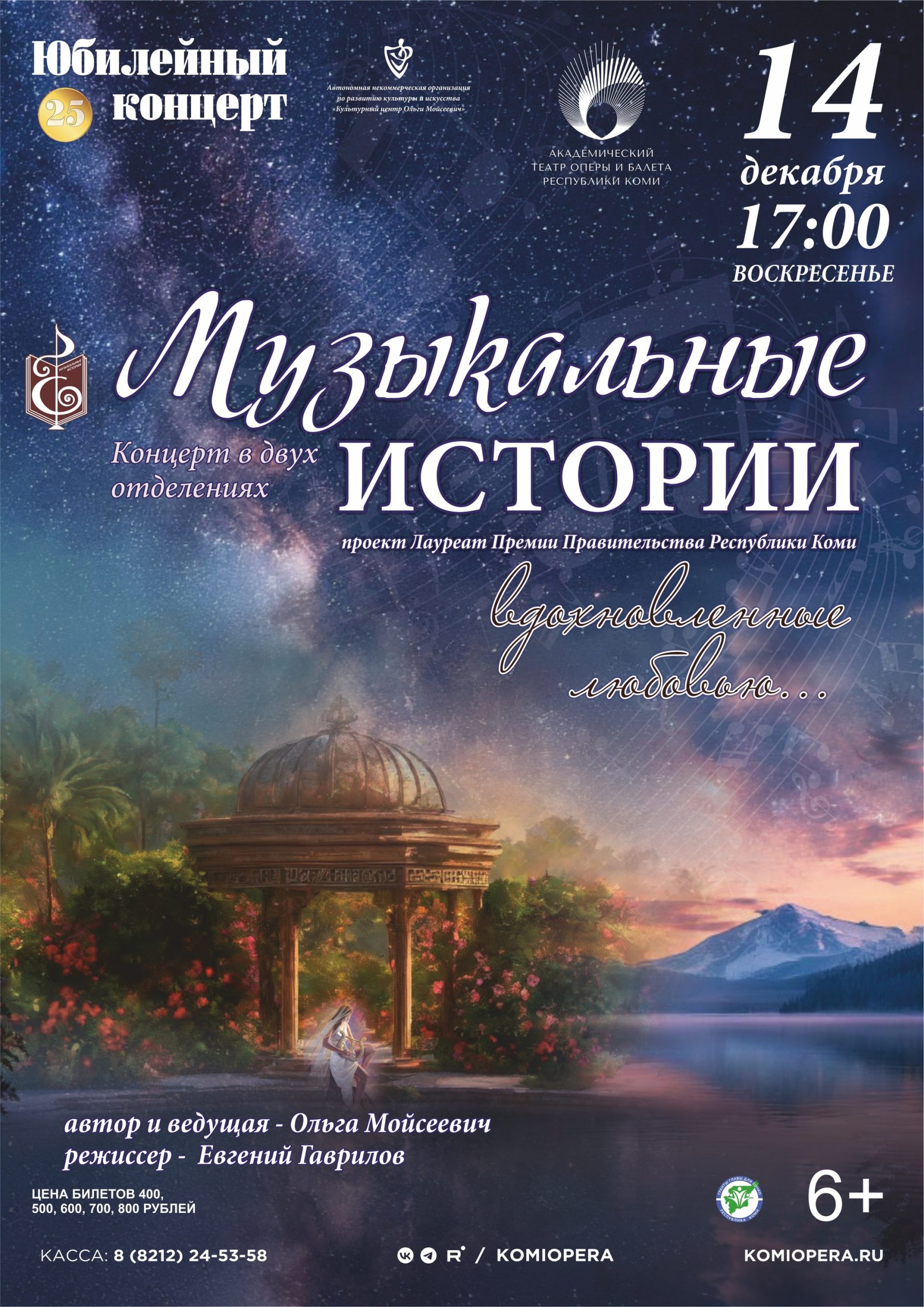 14 декабря в Академическом театре оперы и балета пройдёт второй юбилейный концерт проекта "Музыкальные истории", который в этом сезоне отмечает 25-летие. К такой дате команда проекта подготовила 2 грандиозных концерта – первый состоялся в Коми республиканской академической филармонии 23 октября, второй будет в театре оперы и балета с участием всех театральных коллективов, солистов театра и солистов «Музыкальных историй».