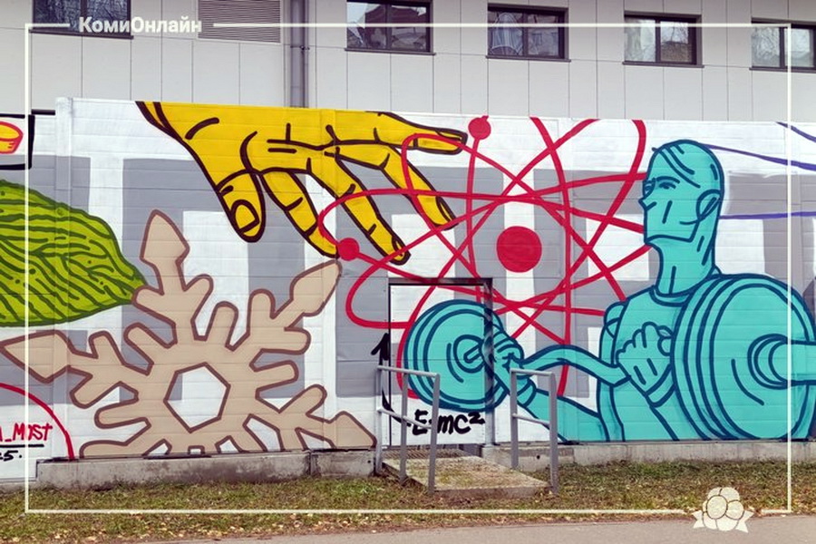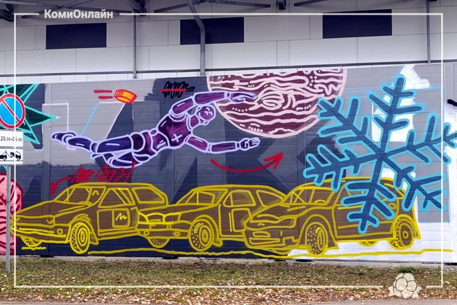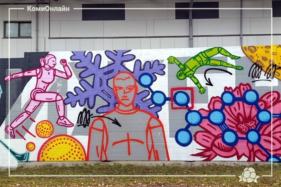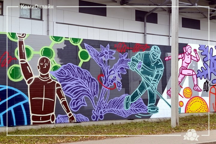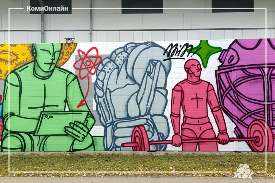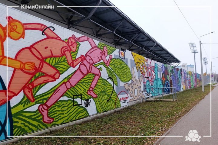 В Сыктывкаре появился 70-метровый мурал с андроидами-спортсменами. Абстракцию на тему спорта, технологий и будущего изобразили на ограждении возле республиканского стадиона со стороны улицы Карла Маркса. Автор рисунка - российский уличный художник Миша Most.