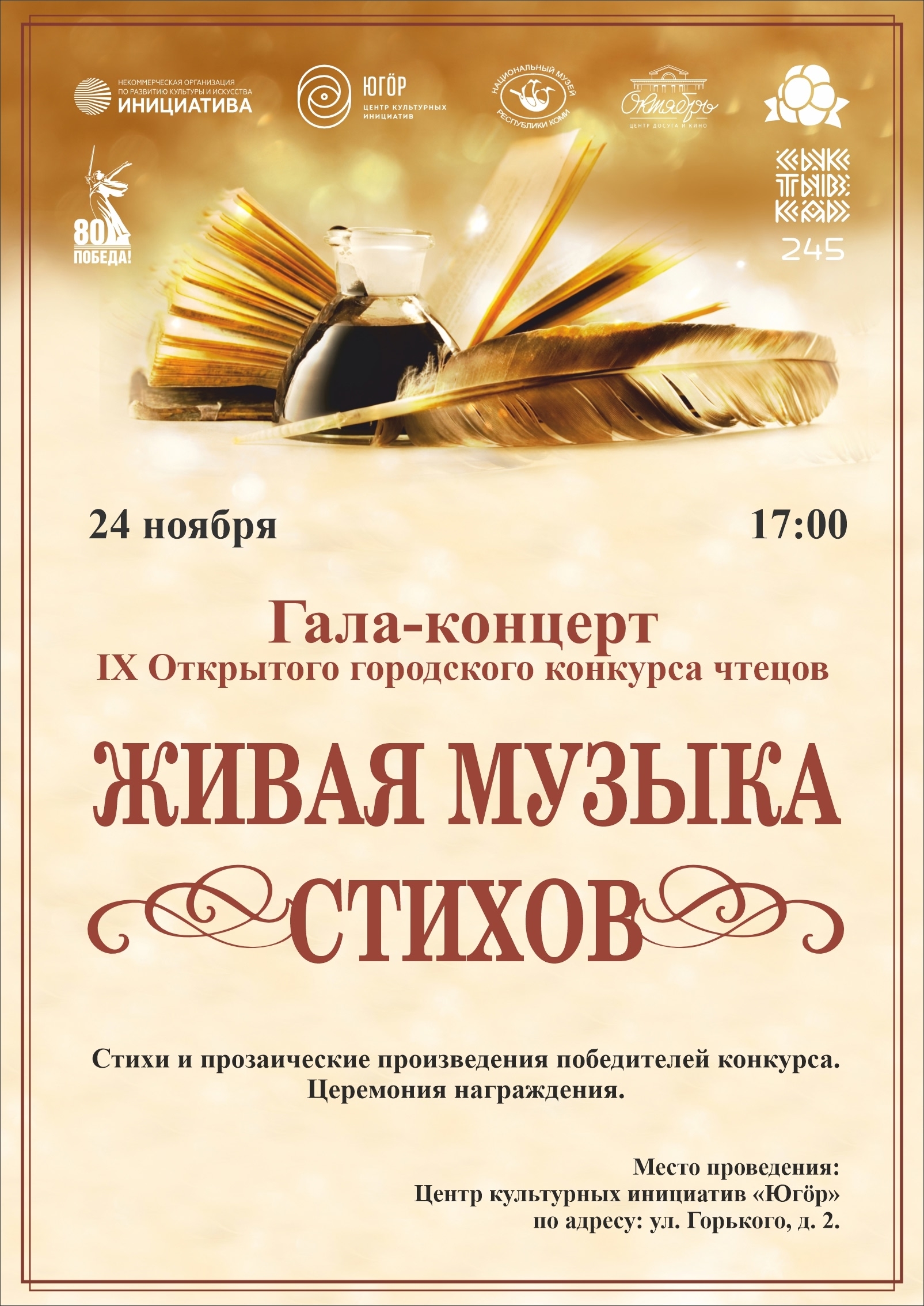 24 ноября в 17:00 часов в Центре культурных инициатив «Югор» (г.Сыктывкар, ул. Горького, д. 2) состоится ГАЛА-КОНЦЕРТ и торжественное награждение лауреатов IX открытого городского конкурса чтецов «ЖИВАЯ МУЗЫКА СТИХОВ».