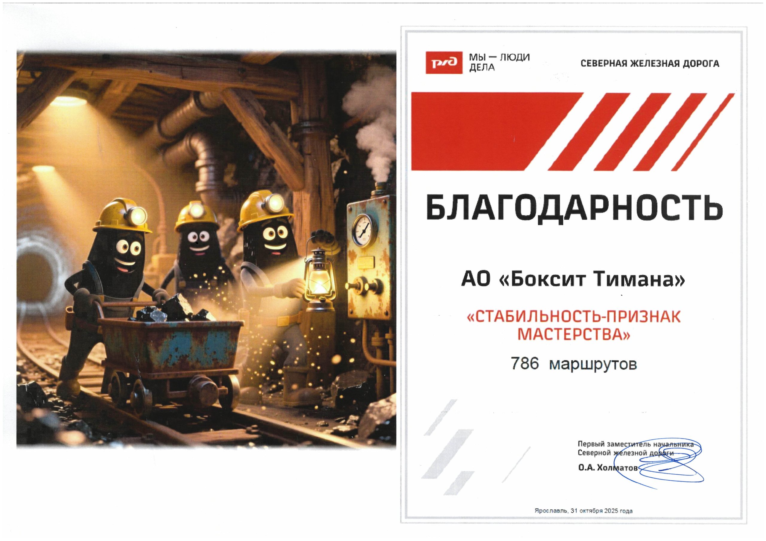 Во время совещания первый заместитель начальника Северной железной дороги Олег Холматов вручил коммерческому директору «Боксита Тимана» благодарность за стабильную работу предприятия. На начало октября 2025 года бокситодобытчики отправили более 780 маршрутов.