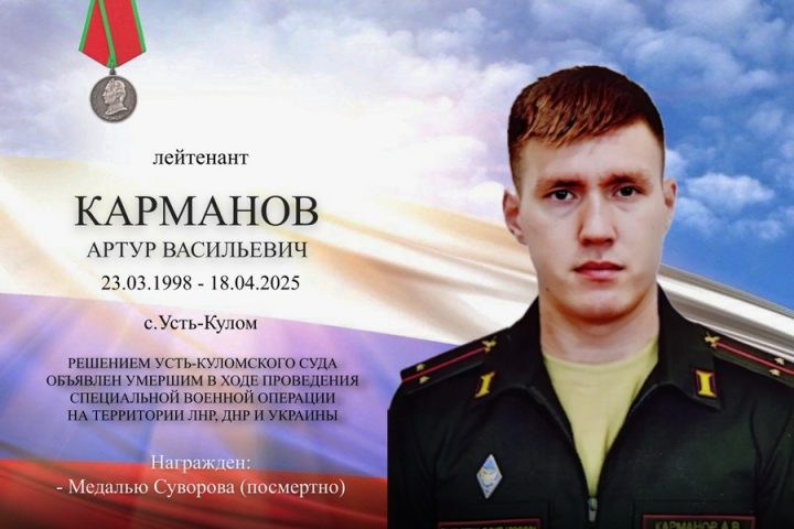 Во время специальной военной операции погиб лейтенант Артур Карманов, сообщает пресс-служба администрации Усть-Куломского района.