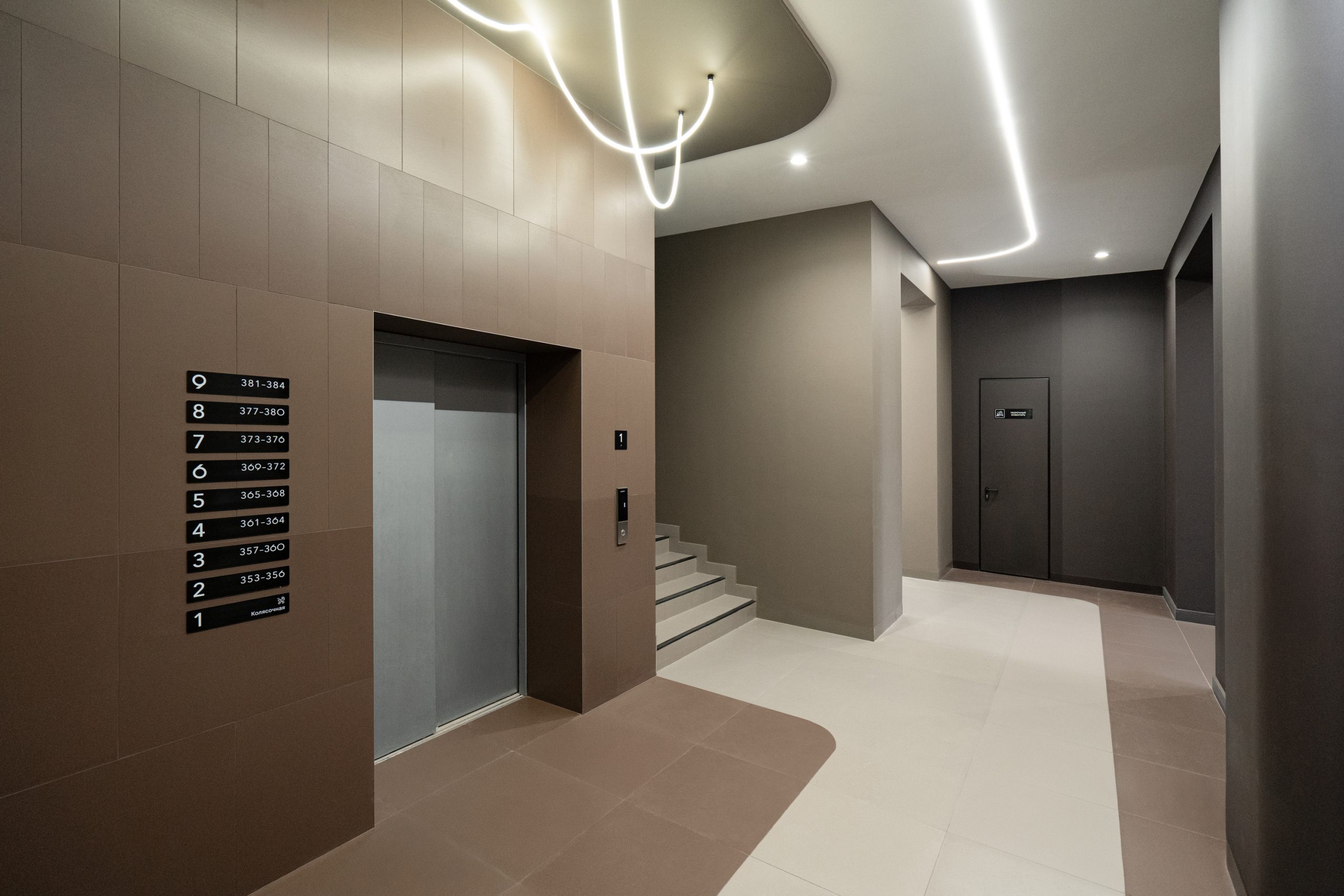 - Необычная разноуровневая архитектура с вечерней подсветкой. Подъезды с холлами в индивидуальном дизайне и с разным количеством квартир на площадке.