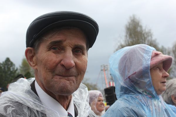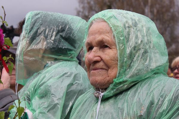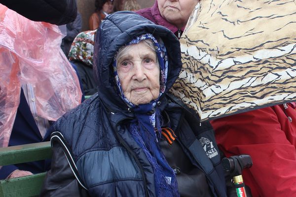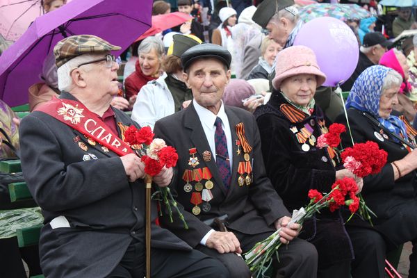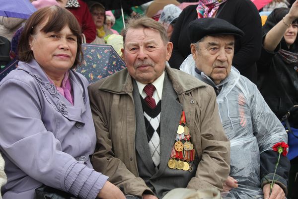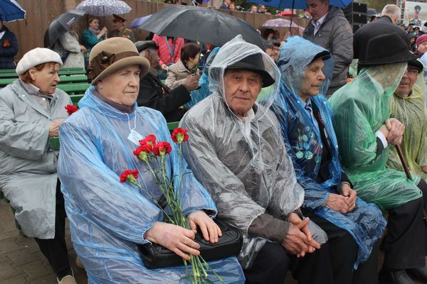 На протяжении большей части представления, усиливаясь и утихая, шел дождь. Ветеранам, расположившимся на трибунах вдоль площади, выдали дождевики. Некоторые решили от них отказаться и смотрели парад под зонтами.